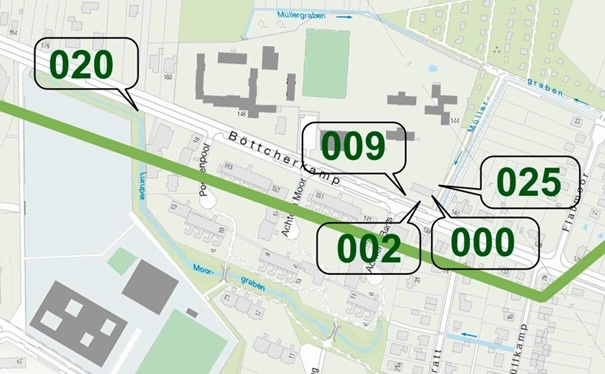 Nun über den Fahrenort in die Peenestraße. Ihr folgt dem Weg geradeaus in den Kleingarten Veermoor bis zum Regenrückhaltebecken am Schnittmoorgraben. Dort haltet Ihr Euch links. Hinter dem Skaterpark folgt Ihr dem Waldweg rechts vom Graben bis zum Vereinshaus Veermoor.