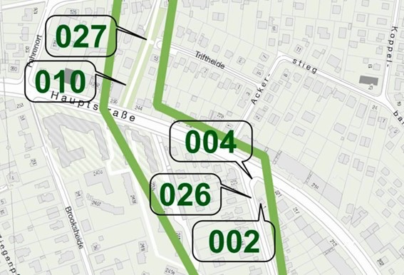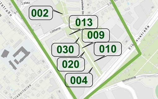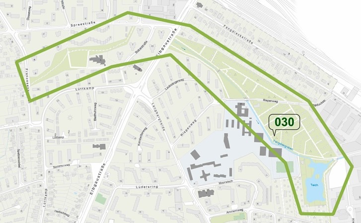 Jetzt überquert ihr die Luruper Haupstraße, haltet Euch links und geht nach ca. 150m rechts in den Grünzug zum Fahrenort.