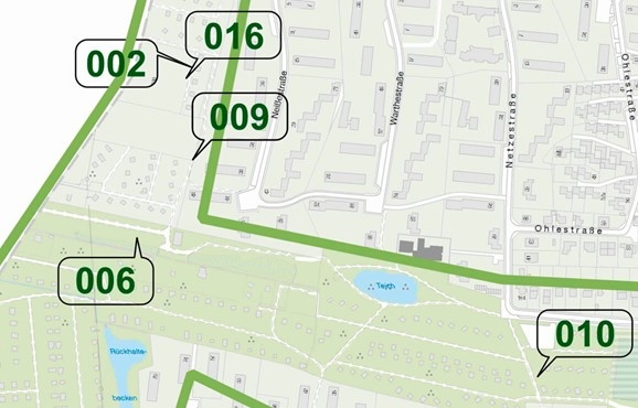 Nun folgt Ihr dem Weg zurück zum Regenrückhaltebecken und geht weiter geradeaus bis zur Ecke Kleiberweg/Netzestraße. Dort biegt Ihr direkt rechts in den Fußweg Richtung Sudestraße.
